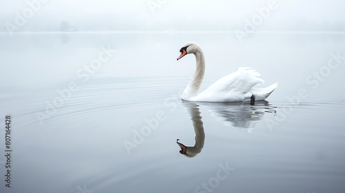 A graceful swan glides across the still waters of a lake, its reflection shimmering in the tranquil surface.