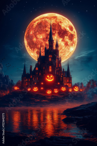 A grand castle sits by a calm lake, adorned with carved pumpkins, glowing warmly beneath a bright full moon in a night sky