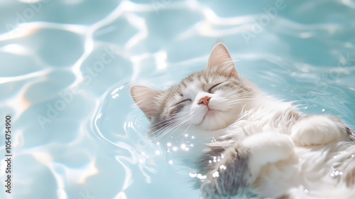 A grey and white fur cat floating in a body of water in the pool, Lean back, sleeping with smile, clear and transparent water, light white and turquoise