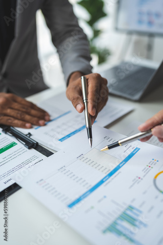 A group of business analysts discuss the summary graph report on business expenses and work information about the company's financial statements.
