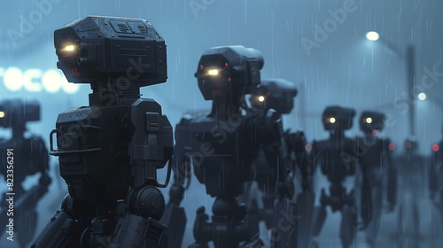 A group of robots are walking down a street in the rain. The robots are all black and have glowing eyes. The scene is set in a futuristic world where robots are a common sight