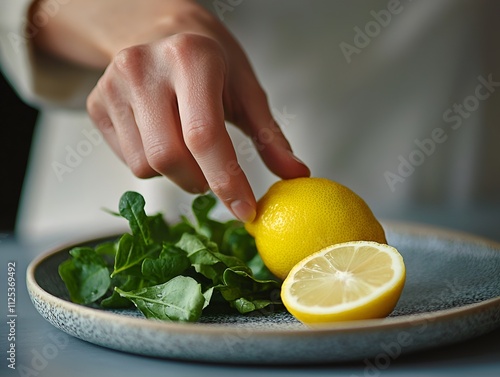 A hand holds a fresh lemon over a plate of bright green leaf salad on a neutral light background