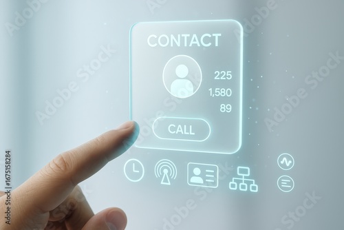 A hand interacts with a futuristic contact interface displaying contact information and call options.