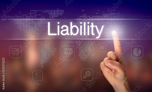 A hand selecting a Liability business concept on a clear screen with a colorful blurred background.