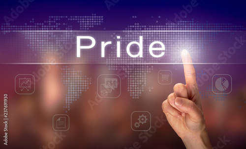 A hand selecting a Pride business concept on a clear screen with a colorful blurred background.
