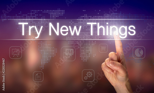 A hand selecting a Try New Things business concept on a clear screen with a colorful blurred background.