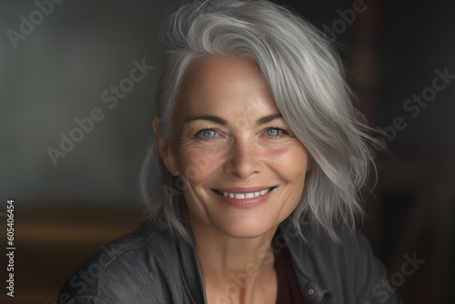 a happy young woman with grey hair in the style of smooth and polished with Generative AI