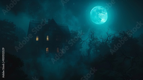 A haunted house with Gothic architecture, silhouetted against a full moon