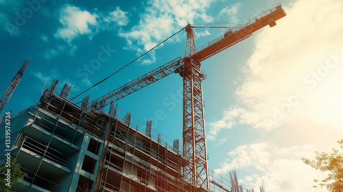 A high crane standing on a construction site, surrounded by scaffolding and building materials