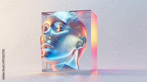 A holographic, metallic human head is enclosed within a transparent glass cube on a white background.