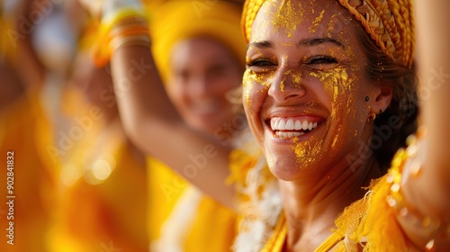 A joyful woman celebrates, adorned in golden paint and surrounded by a sea of yellow, capturing the vivid essence and infectious energy of a lively cultural festival.