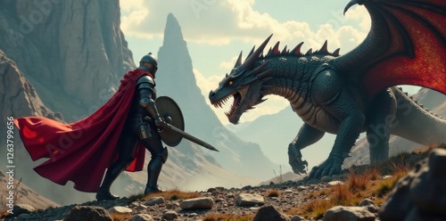 A knight with sword and shield faces off against a fierce dragon, dragons, fantasy, chivalry