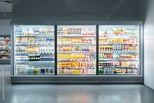 A large commercial refrigerator filled with various food and beverage items in a supermarket aisle