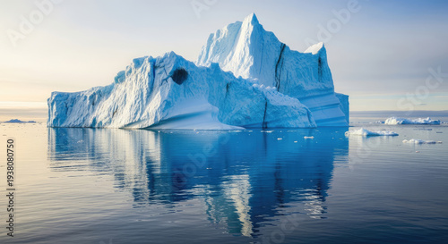 A large iceberg floats serenely in calm ocean waters under a clear sky