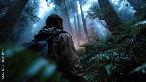 A lone hiker lost in a dense misty forest