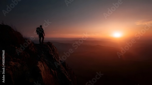 A lone hiker stands silhouetted on a rugged mountain cliff gazing at a breathtaking sunset over a vast layered mountain landscape embodying explo n
