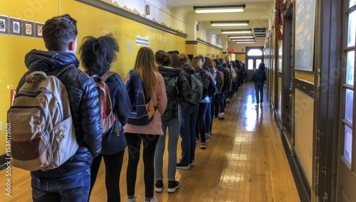 A long line of students waited to enter the classroom, with the photo taken from behind them.