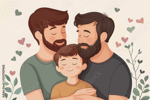 A loving family illustration featuring two fathers embracing their son, surrounded by hearts and greenery, symbolizing warmth and connection.