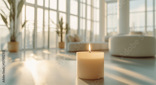 A luxury candle on table,glowing gently in a serene, bright living room with natural light streaming through large windows,Soft white neutral tones,minimalist decor,plush seating create a peaceful