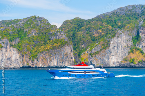 A luxury yacht glides smoothly across bright blue waters, surrounded by towering rocky cliffs Phi Phi island and dense green hills under a clear sky. This tranquil scene captures a perfect day at sea