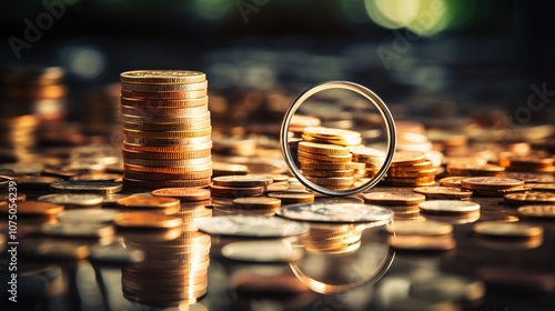 A magnifying glass over stacked coins, symbolizing financial scrutiny and inflation