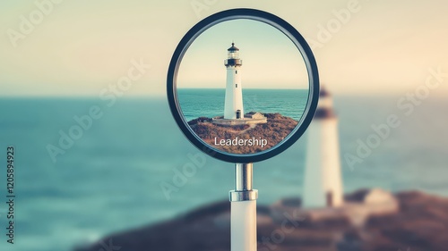 a magnifying on word of business concept. A lighthouse is viewed through a circular lens, highlighting its iconic structure against the ocean backdrop.