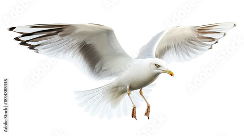 A majestic seagull gracefully soaring through the air with its wings fully extended. its plumage against a clean white background. ideal for nature-themed projects