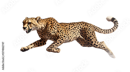 A majestic spotted feline in midstride showcasing its agility and grace against a stark backg
