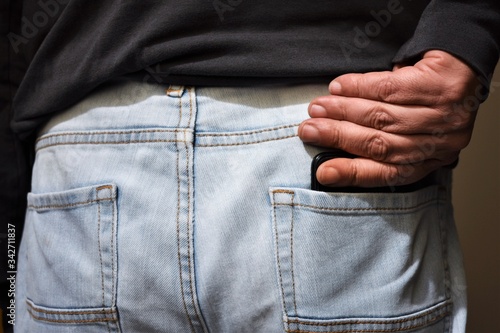 A male hand takes out (or keeps) a smartphone from the back pocket of his jeans