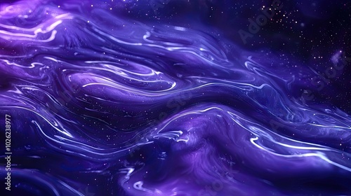 a metallic liquid that resembles flowing mercury, floating in a dark cosmic space. The liquid should appear smooth and highly reflective, with colors
