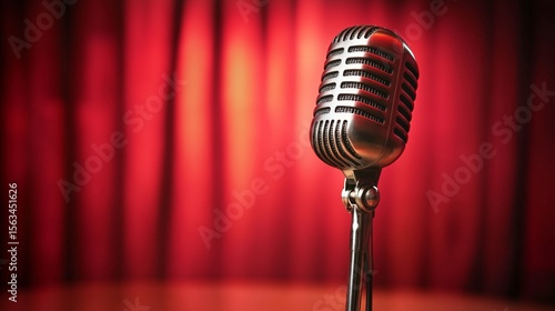 A microphone on a stage with stage lights shining on them, blurred stage background. 6