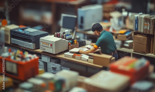 A miniature man works at a desk in a miniature