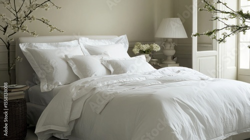 A minimalist bed with crisp white linens and neutral decor