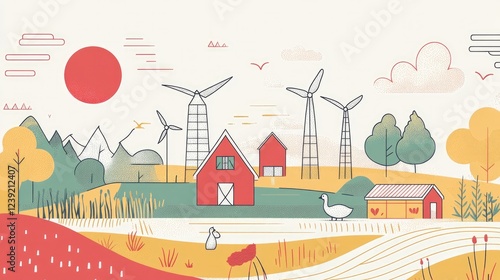 A minimalistic line-art vector illustration of eco-friendly farming, showcasing elements like windmills, barns, geese, and renewable energy sources