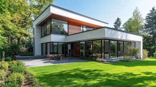 A modern house exterior with sleek, minimalist lines, large windows, and a lush green lawn under bright sunlight.