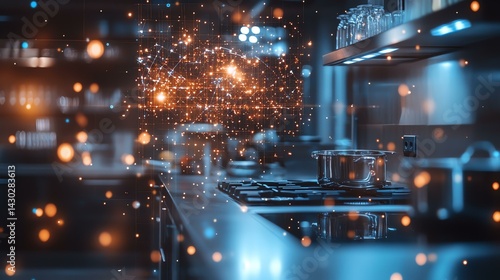 A modern kitchen setting illuminated by shimmering particles, creating an inviting cooking atmosphere.
