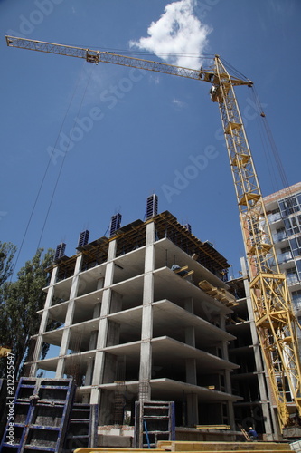 A modern new building. Working crane on the construction of the house. Construction site with cranes on sky background