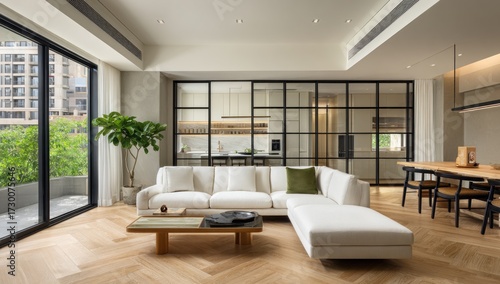 A modern, open-concept living area showcases a neutral color palette, with large windows and a stylishly designed sectional sofa.