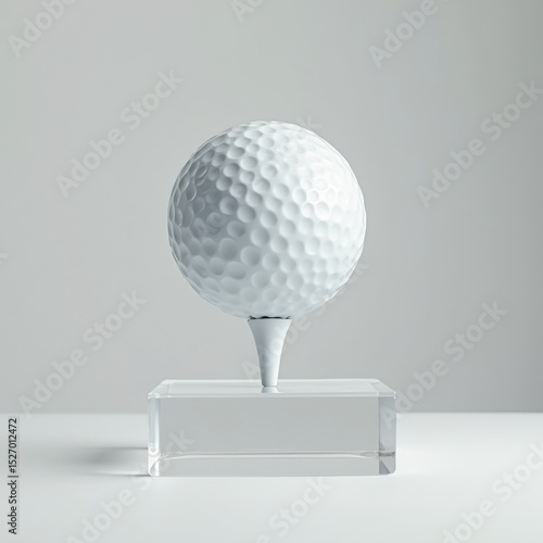 A modern white ball with a minimalist logo on a clear acrylic stand for corporate branding.