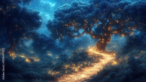 A mystical forest scene illuminated by glowing orbs of light. Ancient trees with gnarled branches rise majestically from the lush undergrowth, their leaves varying shades of deep green. A winding path