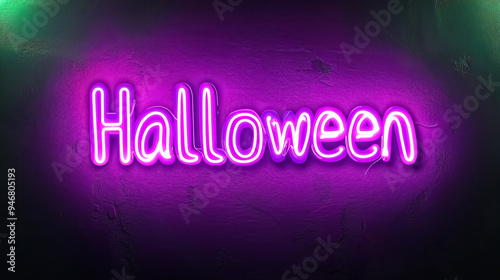A neon sign featuring the word "Halloween" with alternating colors of purple and green neon lights