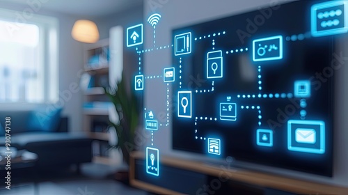 A network of smart devices connecting seamlessly in a modern home, representing IoT and future gadgets.