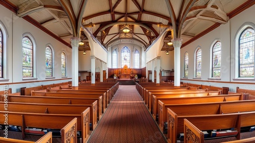A panoramic view of a church interior, highlighting its wide aisles, decorative columns, and tranquil atmosphere with natural light.