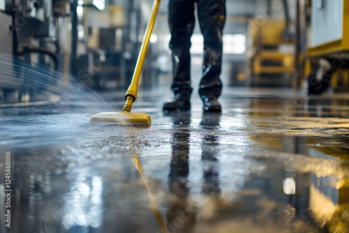 A person cleaning the floor with a yellow water hose in a factory, close-up, high-resolution photography