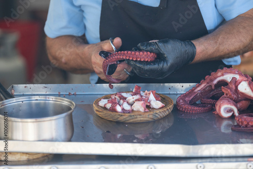 A person is skillfully slicing fresh octopus tentacles at a street market stall, showcasing culinary expertise and attention to detail in seafood preparation.