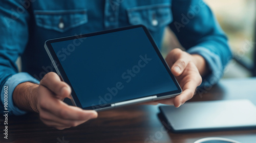 A person sits at a wooden table in a modern workspace, holding a tablet device, engaged with the screen while natural light filters in