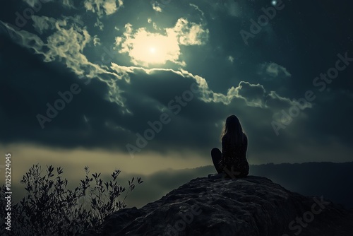 A person sits on a rock gazing contemplatively at a breathtaking moonlit sky, evoking wonder and solitude amid nature.