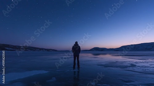 A person standing on a frozen lake at twilight, with stars beginning to appear in the deep blue sky above.
