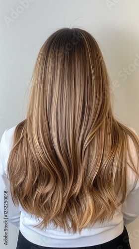 A person with long, shiny hair is facing away, showcasing natural waves and layers. The smooth texture shines under soft indoor lighting against a plain wall
