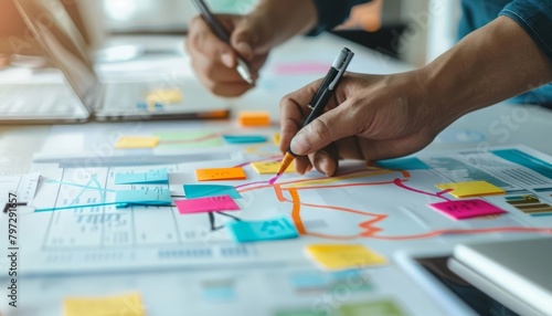 A photo of two people brainstorming ideas. One person is holding a pen and the other is holding a pencil. They are surrounded by sticky notes and papers.